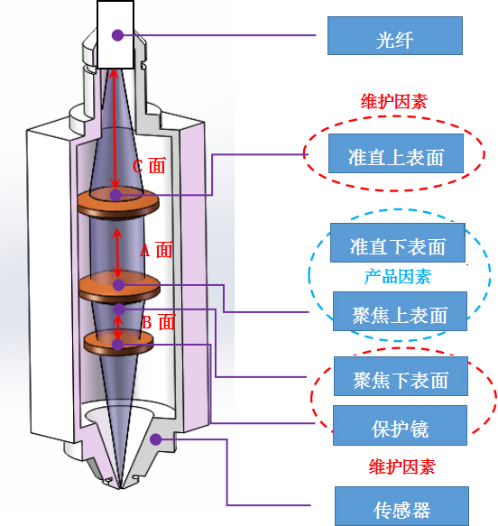 (2)使用非原廠配件、操作失誤或外圍設(shè)備導(dǎo)致保護鏡破裂或燒穿引起內(nèi)部鏡片污染,注意檢查輔助設(shè)備運行是否正常,如比例閥,空壓機等。