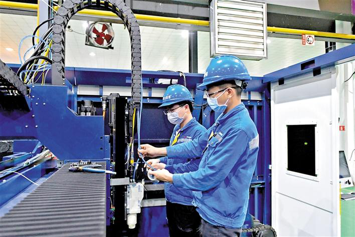 聽!大族激光智能裝備集團(tuán)全國各地生產(chǎn)車間的機(jī)器轟隆聲回蕩著,生產(chǎn)車間馬力全開、各種零件錯落有致,工程師們或凝神工作或步履匆匆,處處是一片熱火朝天的景象。