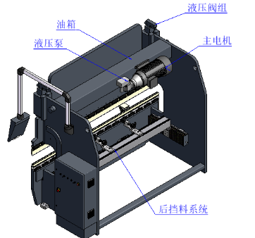 電液伺服液壓折彎?rùn)C(jī)主要由床身、控制系統(tǒng)、液壓系統(tǒng)、后擋料系統(tǒng)、模具及補(bǔ)償機(jī)構(gòu)等部分組成,運(yùn)動(dòng)方式為上動(dòng)式(液壓驅(qū)動(dòng)系統(tǒng)在上面,驅(qū)動(dòng)滑塊上下運(yùn)動(dòng),工作臺(tái)不動(dòng)),其結(jié)構(gòu)復(fù)雜、精度高,設(shè)備安全方面采用了雙重保護(hù)。
