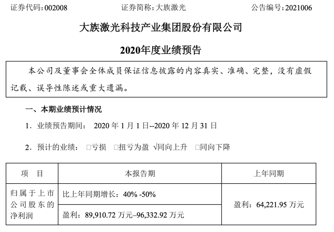 400-666-4000 日前,大族激光發(fā)布公告,預(yù)計(jì)2020年歸屬于上市公司股東的凈利潤(rùn)8.99–9.63億元,比上年同期增長(zhǎng)40%-50%。