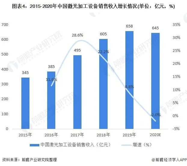中國(guó)激光加工設(shè)備銷售收入約為全球的一半,2015-2020年中國(guó)激光加工設(shè)備銷售收入持續(xù)增長(zhǎng),2019年達(dá)658億元,2020年初步估計(jì)達(dá)到645億元。