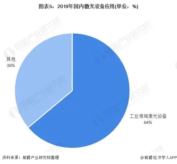 相對(duì)于全球激光設(shè)備應(yīng)用領(lǐng)域,國(guó)內(nèi)激光設(shè)別應(yīng)用較為單一與集中,64%的比重應(yīng)用于工業(yè)領(lǐng)域。