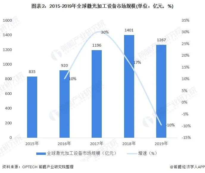 全球激光加工設(shè)備市場(chǎng)規(guī)模超過千億元,2019年達(dá)到1267億元,同比下降10%。