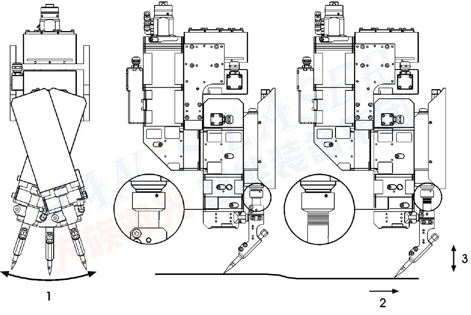 激光從激光器發(fā)出,經(jīng)光纖傳導后被光纖耦合器耦合,自動對焦模塊將發(fā)散的光束進行準直后轉換為平行光束,準直后的平行光束經(jīng)過反射模塊的兩次反射后由光學聚焦模塊聚焦后到達工作面,整個焊接過程可以通過監(jiān)控模塊進行全程監(jiān)控,縱向伸縮臂TA通過自動控制模塊STRG與自動對焦模塊關聯(lián),實現(xiàn)自動對焦,安裝在伸縮臂上的壓力傳感器KS通過STRG與旋轉動作控制模塊關聯(lián),實現(xiàn)焊縫跟蹤。
